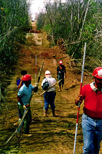 井戸を掘削する準備として、最初に行うのが地震探鉱。ジャングルを切り開いて(ラインカット)その調査する車の道路を作っている風景。